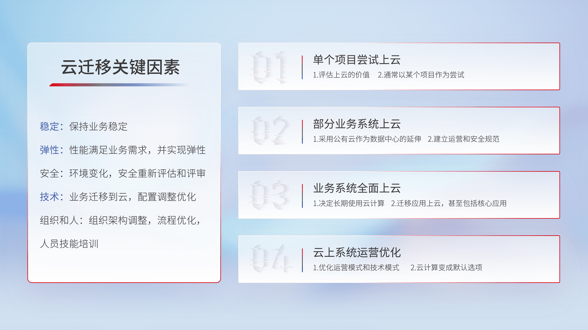 结合实际业务,,从规划设计、、云平台选型、、、云原生改造、、、数据迁移、、、、集成交付,,,,迁移全过程为客户识别最佳上云路径,,,做好风险识别管理,,,,设计网络架构、、、身份权限、、、安全审计合规、、、、操作审计、、、、日志审计、、、、监控告警策略、、多站点容灾设计等,,,对云上基础设施进行整体规划,,,,提升IT治理水平,,以满足弹性、、、高可用、、、高性能的需求。。。。