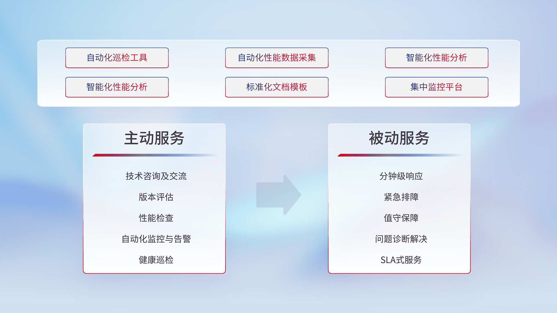 智能化工具和标准化文档,,保障服务质量,,提供主动服务(包含技术咨询、、、版本评估、、、、性能检查、、自动化监控与告警、、、健康巡检)和被动服务包含(分钟级响应、、紧急排障、、、、值守保障、、、、问题诊断解决、、、SLA服务)。。。