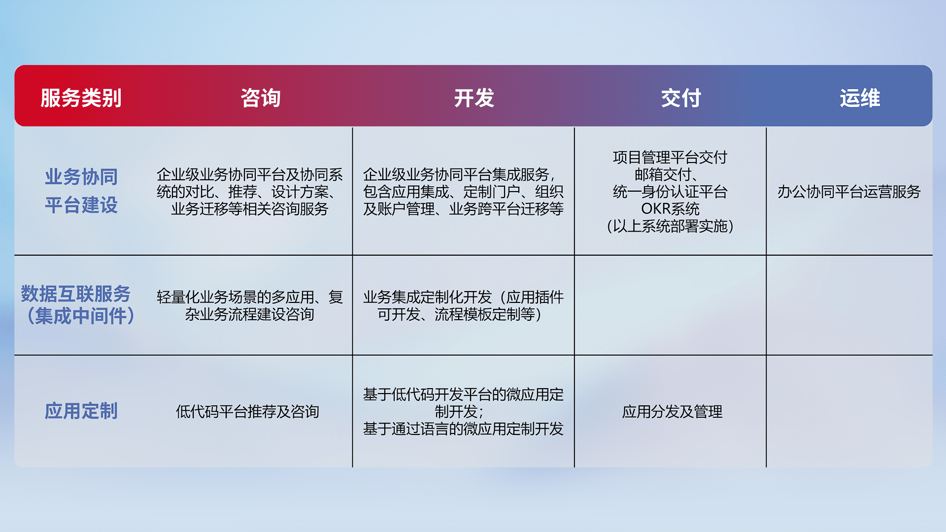针对钉钉、、、、企微、、IDaas等平台级产品提供产品的规划、、、、方案、、交付、、、、定制化开发等服务,,,实现如统一协同办公、、、、智能客户服务、、混合会议管理、、、、智能数据查询、、、等业务场景,,实现数字化转型。。。。